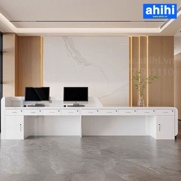 Trong thiết kế nội thất văn phòng, quầy lễ tân là bộ mặt của toàn bộ thiết là nơi người khác nhìn vào đầu tiên khi bước vào văn phòng của bạn. Để tạo được một ấn tượng tốt cần phải lựa chọn các mẫu quầy lễ tân một cách hợp lý từ kích thước, màu sắc, loại chất liệu. Chúng tôi cung cấp Quầy tiếp tân (lễ tân), quầy thu ngân (quầy tính tiền), quầy cafe, kiểu dang đa dạng: bo góc,hình chữ nhật, chữ L … với nhiều sự lựa chọn chất liệu như gỗ, MDF, MFC, HMR chóng trầy xước, chống ấm tốt. Bàn lễ tân tại ahihi được sản xuất trên dây chuyền hiện đại. Với mẫu mã phong phú đi cùng chất lượng vượt trội, chắc chắn bạn sẽ chọn được sản phẩm phù hợp với nhu cầu sử dụng. Vậy lý do tại sao bạn nên chọn bàn lễ tân đầu cho các doanh nghiệp, cơ quan của bạn ?
